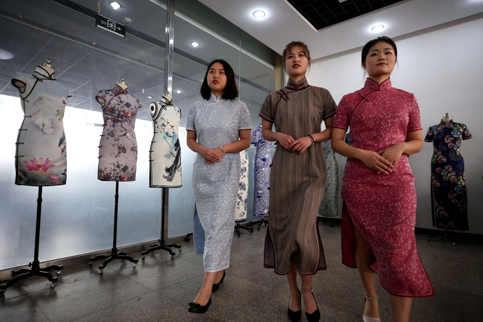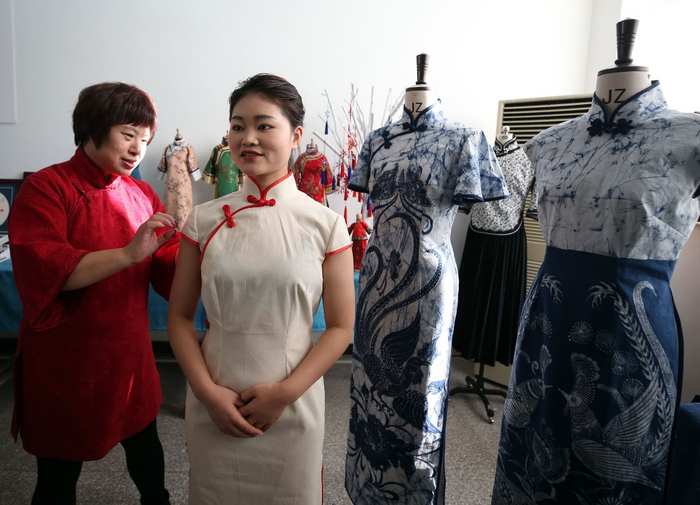 外出表演展示的旗袍缝制出来后,还需要模特穿在身上观看效果。