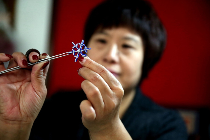 为迎接2022冬奥会的临近,张凤兰特别设计制作了雪花系列衍生品。