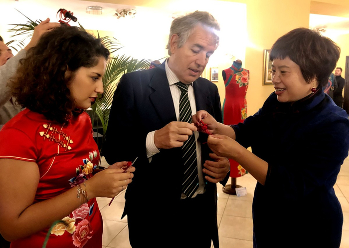 张凤兰与外国友人交流,让他们了解中国文化,了解京式旗袍。