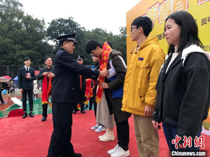 出席启动仪式的嘉宾给外卖小哥及学生代表授“反诈使者”绶带。 蒋雪林 摄