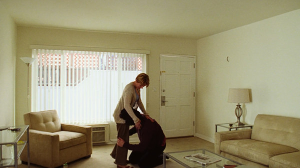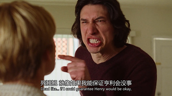 《婚姻故事》的这场戏发生在查理的临时公寓中。他们先是友好地交谈,然后鼓起勇气决定揭开婚姻溃烂的创口,继而爆发争吵,以哭泣着互诉“对不起”而终结。在这个过程中,镜头扮演在场的旁观者角色,随二人情绪的起伏敏捷地移动。它对二人一视同仁,允许他们在固定的框内进进出出,均匀分配对切镜头,以他们的视角注视对方。说出“我每天早晨起床都巴不得你死掉”的恶毒话时,原本凑近他们的镜头不由自主地后退,仿佛是两个人情绪起伏的强烈气流推开了这个见证心碎场景的“第三者”。