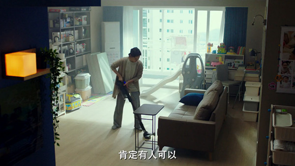 金智英的天地比妮可小得多。她初次登场的“舞台”是一套位于首尔的公寓,金智英一身柔软的燕麦色/烟灰色衣裤,正洗衣、吸尘、整理玩具。接下来的整部影片中,金智英的主要活动场景都在这套公寓内。观众会发现,他们的公寓阳台面对另一栋高楼,远眺的视线受阻。但换一个角度,远处露出一片青色群山。