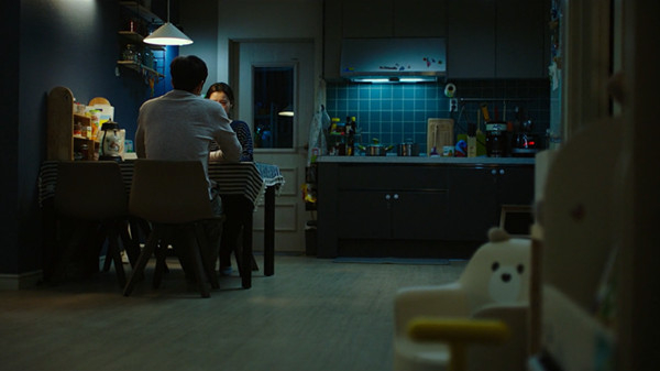 《82年生的金智英》中也有这样一场夫妻开诚布公交谈的戏,但交谈发生在昏冥的夜晚,气氛与明亮的沙漠阳光截然不同。这里的镜头更像一个保持距离的窥视者,经常躲在一个人的背后注视另一个人的面庞。“金智英”的情绪比“婚姻故事”内敛得多。丈夫郑大贤在欲言又止中告诉她,你生病了,“你有时会变成另一个人”。这时镜头不再躲闪,在夫妻二人含泪的面孔之间对切。与《婚姻故事》里风中火苗般剧烈抖动的摊牌戏相反,这里特写镜头的核心是金智英漆黑的双眼,像深渊,吞没二人所有的情感波动。