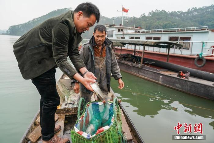 12月19日,广西横县西津水库,余富(左)正在挑选制作鱼生所用的鱼。