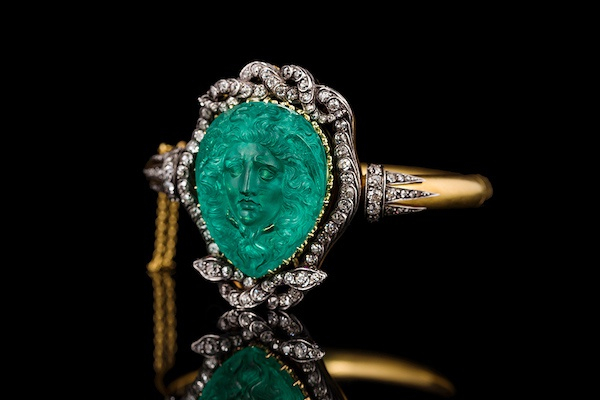 在“历史之眼”的展区内,一只清澈无比,重达65克拉的哥伦比亚祖母绿制成的手镯吸引了前来的众多观者驻足拍照留念。匠人在这颗祖母绿上以近乎完美的手法雕刻出了美杜莎的脸庞。美杜莎是古希腊神话中的戈耳工女妖之一,传说,头上环绕毒蛇,长着利爪钢牙,刀剑不入,人只要与她们目光对视,马上就会变成石头。3D特效的美杜莎会时刻注视到每个参观者的方位,而是否敢注视眼神成为每个参观者的挑战。