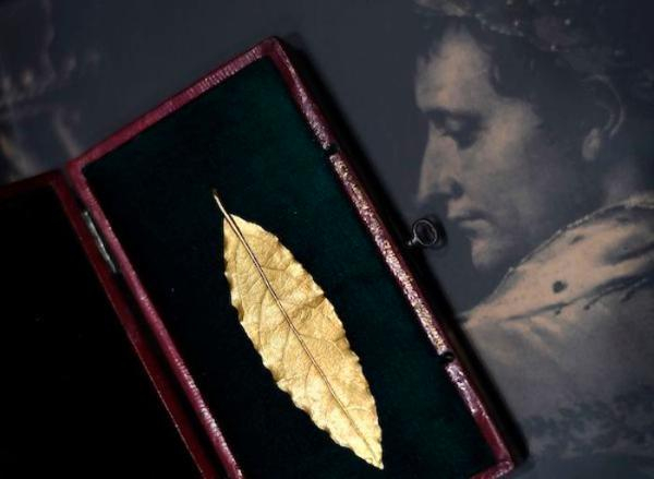 拿破仑的这顶月桂树叶金冕的设计灵感来自于罗马皇帝凯撒的皇冠,原本共有50片金叶组成。在1804年的加冕典礼前,拿破仑感觉冕的重量太重戴在头上很不舒服,于是摘下了六片金叶,2017年拍卖的金叶就是其中之一,也是此次展出的明星展品。