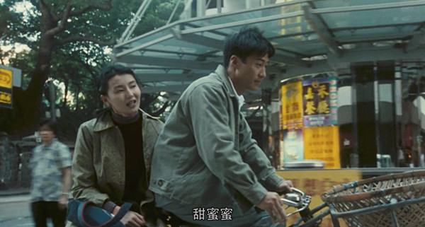 黎小军载着李翘骑单车的一幕也是后来许多爱情片争相模仿的片段,《超时空同居》里也有佟丽娅与雷佳音骑着自行车的迷影致敬片段。电影在这里第一次响起邓丽君的歌声,李翘摇晃着双脚在黎小军的自行车后座上惬意地与他一起合唱着《甜蜜蜜》。