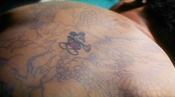 李翘说自己什么都不怕只怕老鼠,第二次来找李翘按摩,豹哥就在背上纹了个米老鼠示好。这枚米老鼠纹身也让无数影迷回味。