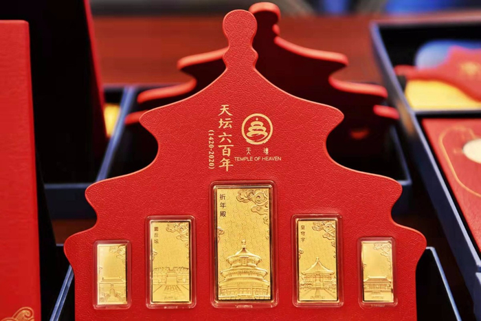 其中,“天坛六百年”纪念金条和纪念金章两款文创产品,以天坛五大主要建筑祈年殿、圜丘、皇穹宇、斋宫、神乐署为设计元素,背面突出运用了祈年殿造型并刻有“天坛六百年1420-2020”字样。该产品运用尖端贵金属薄片工艺与高浮雕油压工艺铸造成型,精致细腻。