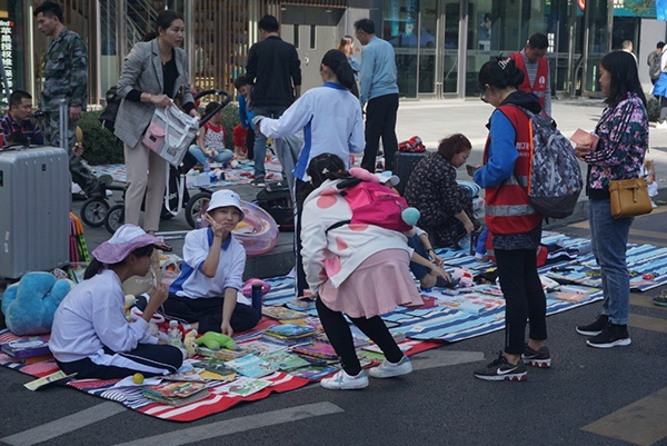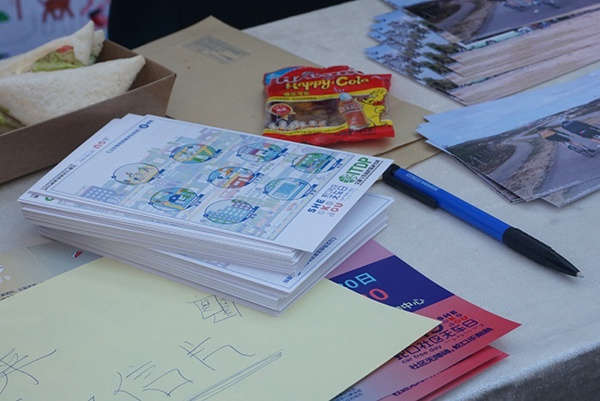 兴华路在游行队伍通过后,并没有回归平静,而是被更活跃的人群占据。三明治制作、建筑工作坊、乐高积木和“(我在蛇口)玩泥巴”的摊位沿道路两侧一字排开。更多的则是席地而坐,响应号召组成跳蚤市场,出售所得用于捐赠资助蛇口社区基金会。