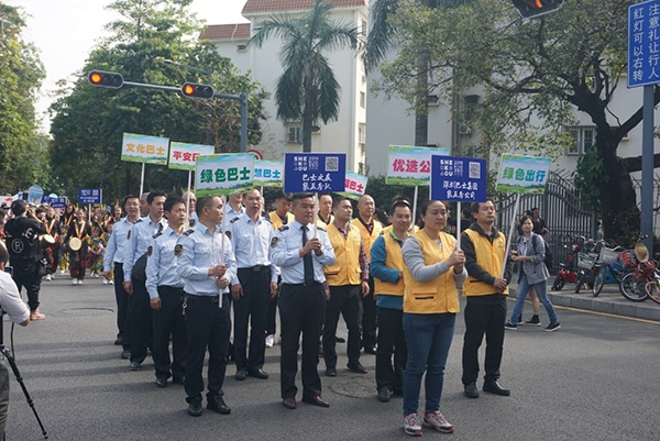 “绿色出行,优选公交!”——深圳巴士集团第五分公司员工组成的游行方阵。