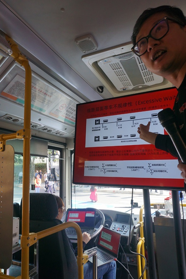 演讲者以年轻人喜闻乐见的方式,宣传公交出行。首先放映了多个来自国外的广告,展示他们倡导公交出行的传播方式和创意。接着,刘先生讲解了一些公共交通服务质量涉及的概念,包括公交站点“最后一公里”可达性,和新加坡巴士服务可靠性框架(BSRF)中的线路层面候车时间不规律性,即额外候车时间(EWT,Excess Wait Time)指标。“平均实际候车时间等于实际间隔时长平方的N sigma除以两倍的实际间隔时长N sigma……”车厢内爆发出“不明觉厉”的欢呼声。