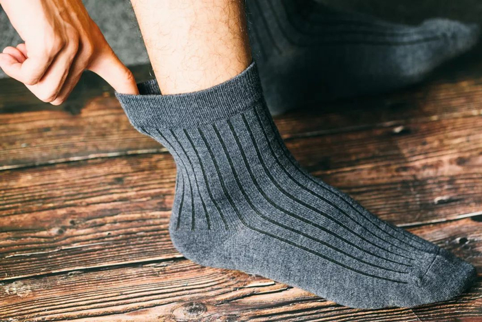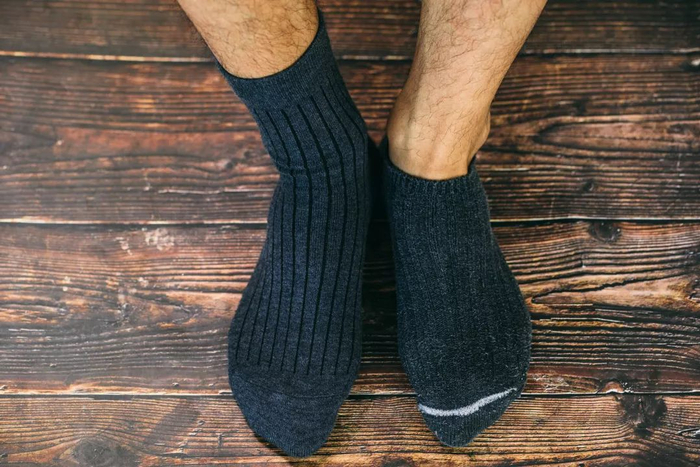 不信我们就来做一个小测试,我司帅气小哥一只脚穿着普通的袜子,一只脚穿着基础生活羊毛袜。