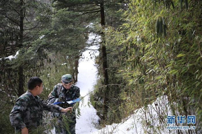 12月13日,巡护员张雄(右)和许可在观察记录野生大熊猫主要食物之一缺苞箭竹的生长情况 新华社发(杜哲宇摄)