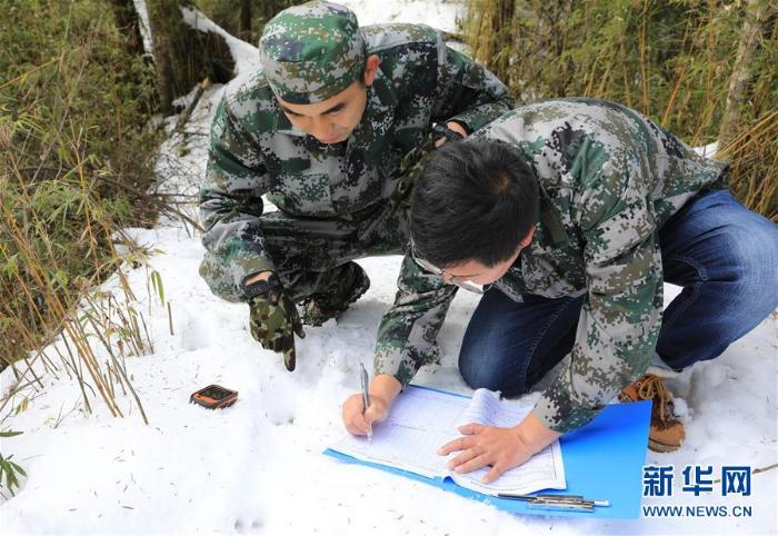 12月13日,巡护员张雄(左)和许可在记录沿途发现的动物足迹 新华社发(杜哲宇摄)