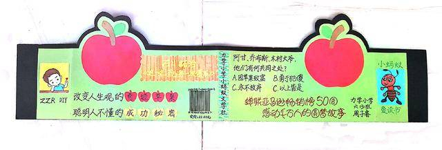 五、六年级同学制作的腰封更是充满思考和想象。有同学在《福尔摩斯》腰封上写上一句主人公最经典的台词:排除所有不可能的,剩下的即使再不可思议,那也是事实。枯树、黄包车、灰瓦房……五(7)班宫雨辰为《城南旧事》腰封绘制原创插画,清淡的色彩描摹出作家林海英童年的记忆。六(3)班周子睿推荐“网红”读物《这一生,至少当一次傻瓜》,他在腰封上出了一道选择题:阿甘、乔布斯、木村大爷,他们有什么共同之处?答案:A因苹果致富B勇于犯傻 C永不放弃 D以上皆是,一道题目引发读者无限遐想。