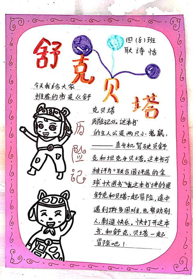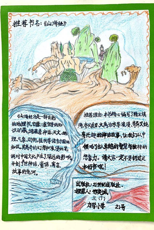 力学小学三(7)班的邢奕诚为《山海经》重新撰写了推荐理由:这本书精心编写了精卫填海、夸父逐日等浪漫、奇异又饶有兴趣的神话故事,让我们从中领略古人卓越的智慧与独特的想象力。请大家不要错过这本好书!四(9)班汪涵西在推荐《小王子》时分享了自己的感悟:这本书提醒我们最简单的快乐和最淳朴的感情,告诉我们快乐的来源有时候一朵雪花、一片绿叶、一朵小花、一滴小水滴,来源于我们在生活中发现的点滴惊喜。