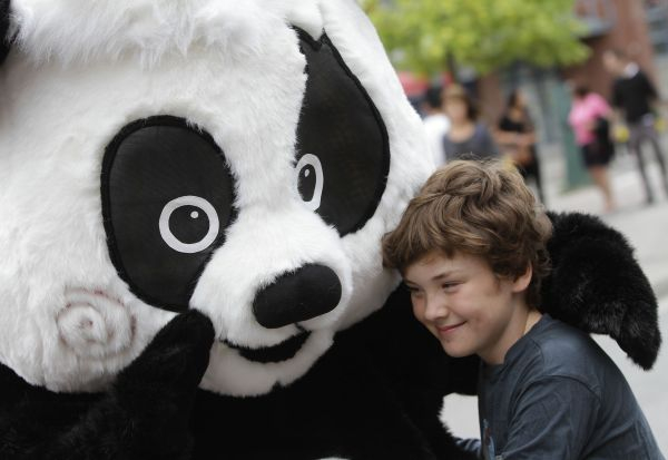 资料图片:2015年8月,在加拿大温哥华,一名小男孩与唐人街吉祥物大熊猫“威威”拥抱。(新华社)
