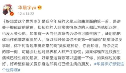 12月4日,华晨宇发了一首新歌——《好想爱这个世界啊》: