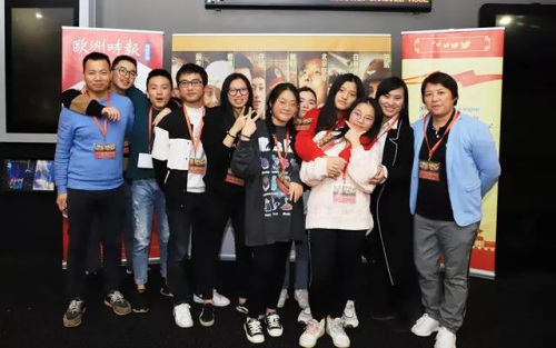 观影前,观众高举国旗在电影放映厅合影。(《欧洲时报》/林碧燕 摄)