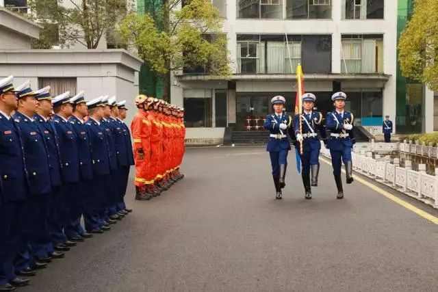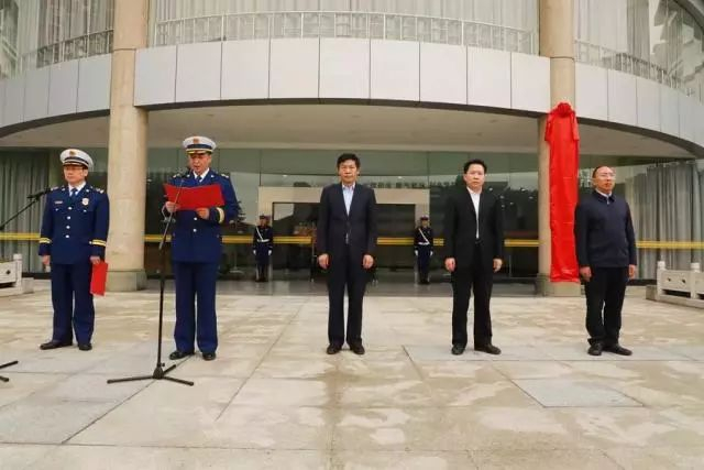 上午12时许,挂牌仪式正式开始,全场高唱国歌,鲜艳的五星红旗冉冉升起。升旗仪式后,3名身着制式服装消防救援人员踏着矫健步伐,铿锵有力地护送中国消防救援队队旗走到队伍前列。