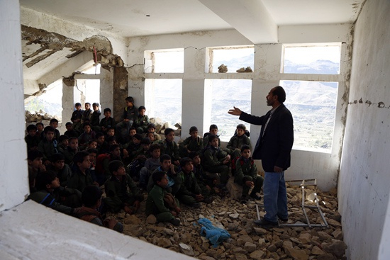 12月23日,在也门伊卜省一所遭过空袭的学校教室里,老师为孩子们授课。战争给也门教育系统带来严重影响。据统计,目前也门失学儿童数量已达200万,另有370万儿童面临辍学风险。那些还在上学的儿童也处于艰难的学习环境,很多孩子甚至不得不在空袭后的教室废墟内上课。穆罕默德/摄(新华社发)