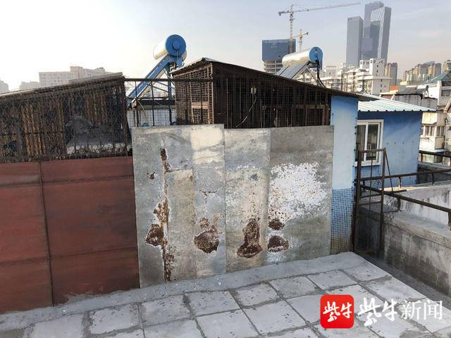 记者在王女士家中看到,阳台窗户紧闭,玻璃上明显有鸟类粪便痕迹。走上顶楼可以看到一座约10平方米的铁皮棚,里面饲养了不少鸽子。而且楼顶的隔热板被部分拆除,整个鸽棚“嵌”在房顶上。王女士认为,自家房顶有一处经常返潮、开裂,可能和楼顶结构被破坏有关。