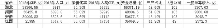 表:长江中游四省2018年主要经济指标(来源:第一财经根据各地统计公报 公开资料统计)