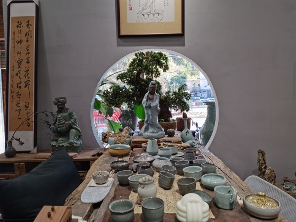 简单来说,是一个以国营龙泉瓷厂为主体的青瓷主题文化旅游综合体,从青瓷文化展示、青瓷体验再到吃饭住宿全部涵盖。在里头,你也会发现,10元3件的青瓷比比皆是,甚至有“青瓷超市”,老板在店门口摆一个音响,放着翻唱版本的歌舞厅音乐。