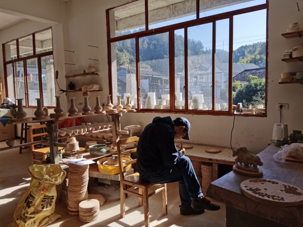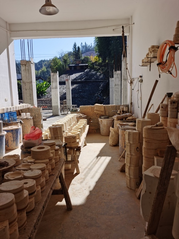 曾芹记规模大,分工明确,冬日暖阳下,工人坐在旋坯作,右手握钨钢修坯刀,左手护住陶坯。先削去底部的多余的泥,用修坯刀,顺着重心将底部修出底足。还有专门贴标签的人,负责将批量生产的橡皮logo“曾芹记”裁剪,贴在每件器物的底部用来烧制成一体。碰到熟人,吴建波用当地话和她聊了起来,想起跟我介绍,“我们一起在美院接受继续教育的”。
