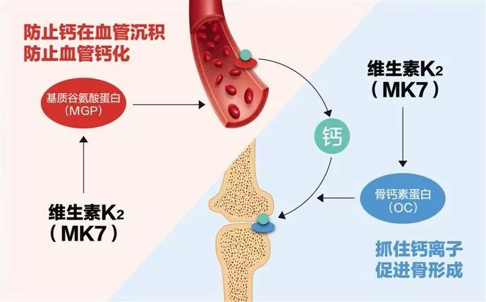 要让血液中的钙不“迷路”,精准进入骨骼、牙齿等人体所需要的部位,需要维生素K₂的引领。现代医学证实,维生素K₂具有调节钙离子沉积、并将错误部位所沉积的钙离子移除的双重功能。维生素K₂可有效激活基质谷氨酸和骨钙素两个蛋白,既减少血液中的钙向血管等软组织沉积,又能抓住这些钙向骨骼“精准迁移”,促进骨形成,让钙真正补进骨骼里。
