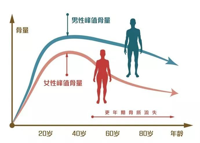 人体一般在30岁-35岁时会达到一生中的骨量峰值,50岁起平均每年丢失0.5%~1%的骨量。绝经期后女性骨质流失尤其严重,骨质疏松症的风险也更高。峰值骨量就如同人体内的“骨银行”,年轻时峰值骨量越高,相当于在“银行”中的“储蓄”越多,可供人们日后消耗的骨量就越多。骨质疏松症患病几率和年轻时候积累的骨量峰值有着莫大的关系。因此,年轻时好好补钙对预防骨质疏松有好处,年纪大了更要好好补钙,弥补骨骼里流失的钙。