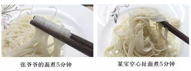 为了考验手工面的特质,公平起见,煮了2份面,5分钟后,张爷爷家的面依旧晶莹剔透,根根分明,而某宝的空心面却早已不忍直视,糊成了面团。
