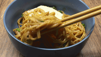 将面放入事先按比例放置的调料碗中,让面与料进行充分的交融。挂面非常易搅拌,韧性可见。