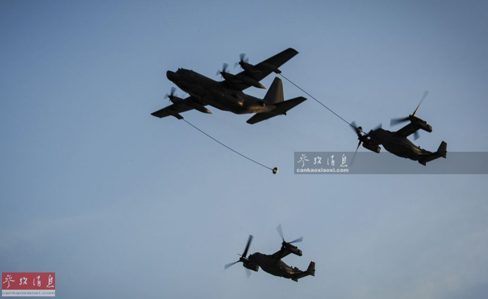 MC-130H还有一大任务就是为战区内执行战场搜救任务的美空军直升机及倾转旋翼机提供空中加油。图为美空军MC-130H为CV-22倾转旋翼机进行编队空中加油资料图。