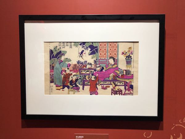 展览现场,《母儿满床欢》,清代(苏州桃花坞彩色套印)