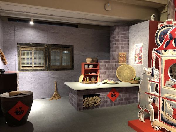 展厅内模拟灶头场景,灶头上贴着灶神