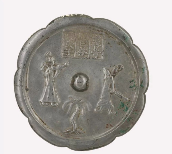 “孔夫子问曰答荣启奇”铭故事镜,又称三乐镜。画面故事源于《列子·天瑞》,荣启奇为春秋时人,孔子问荣启奇为何而乐。荣启奇答曰:以人为贵,我为人,一乐。男尊女卑,我为男,二乐。长寿为三乐。故事中包含着孔子“仁”的人本思想和乐观的人生智慧,但也反映了当时男尊女卑的社会现实。