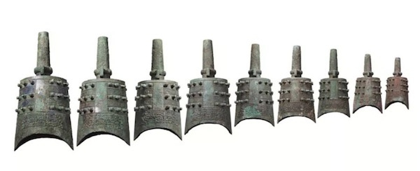 此组编钟共9 枚,形制、装饰花纹相同,大小依次递减。器甬、舞、篆、鼓部饰蟠螭纹,细密繁复,凹凸有致。9 器均铸铭文,字数不等,自名为“行钟”。春秋时期,编钟的数目比西周时期增加,构成完整的宫、商、角、征、羽五声音阶。