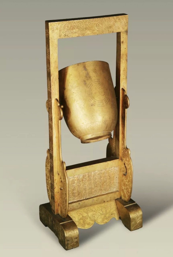 欹器在汉代以后逐渐失传,后代多有研究和仿制,但多不存世,这件欹器是清光绪年间造办处制作进呈给光绪帝的。