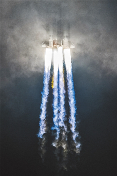 12月27日20时45分,长征五号遥三运载火箭在中国文昌航天发射场点火。本报记者 雷 声摄