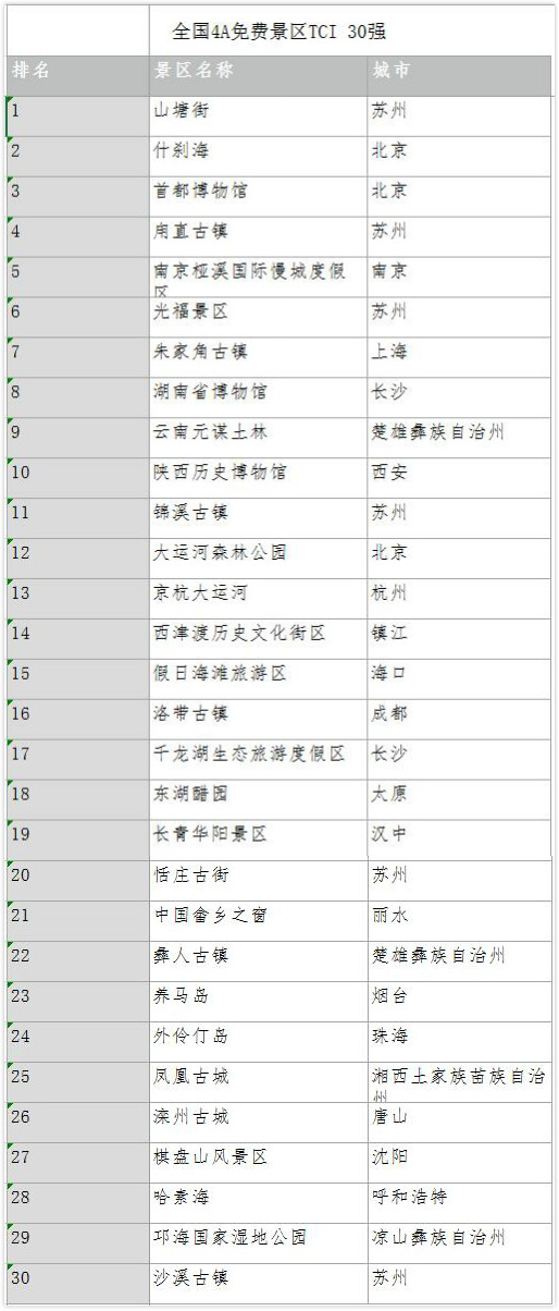 表4 全国4A免费景区TCI 30强