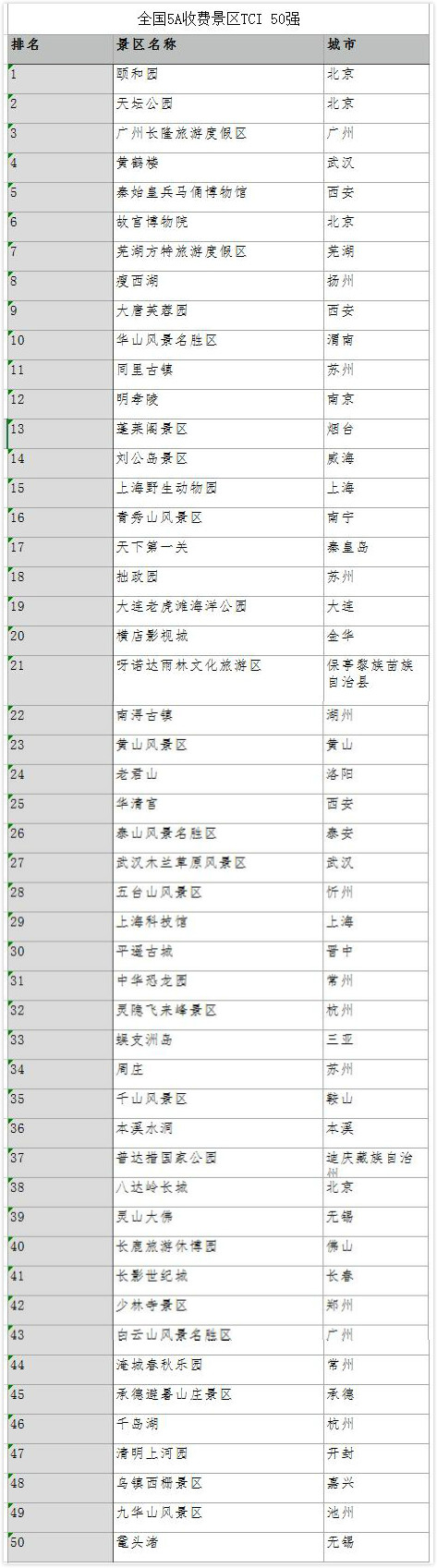 表1 全国5A收费景区TCI 50强
