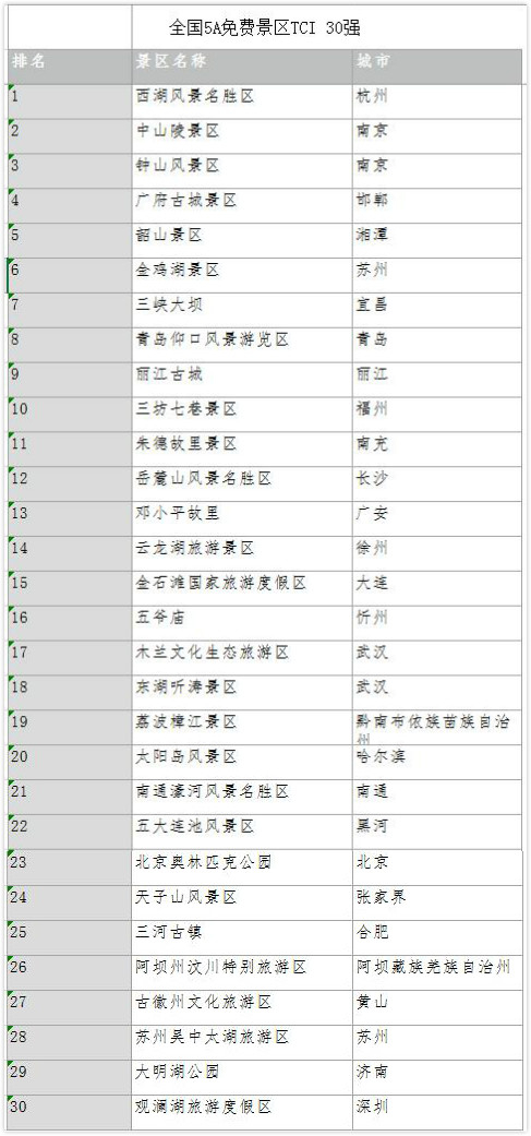表3 全国5A免费景区TCI 30强