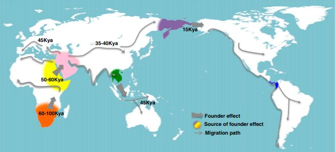 人类在全球上扩张的过程中,可能就经历了多次大大小小的种群瓶颈。最后,这些人口瓶颈引起的一系列“创始人效应”也成就了如今人类的多样性。