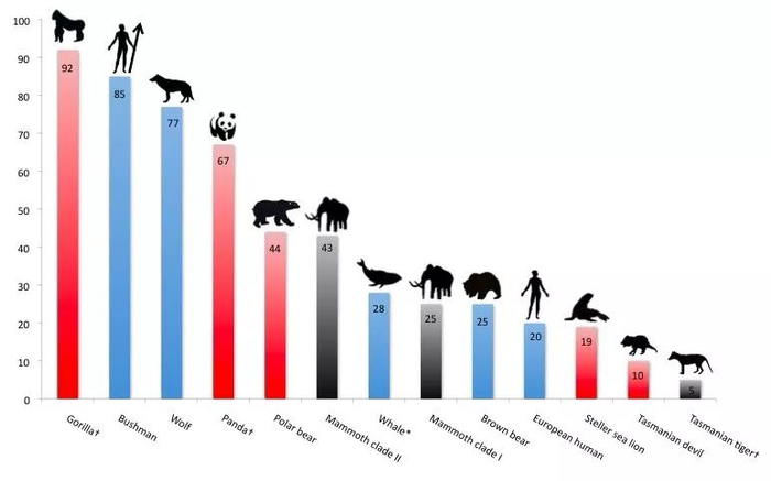 各个物种或人种的遗传多样性对比,濒危物种标红,灭绝物种标黑