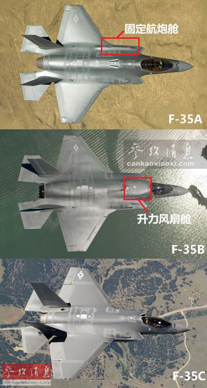 这张对比图详细列举了F-35系列三型号的作战性能,其中F-35A(空军型)是唯一配备固定航炮的型号,F-35B则是三型中唯一具备短垂起降能力的,而F-35C(海军舰载型)是三种型号中尺寸最大的,其作战半径也是三型中最大的,三种型号的最大平飞速度均为1.6马赫。