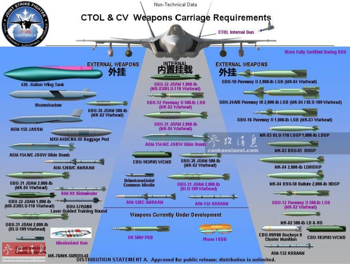 本图展示了F-35C(海军)舰载型能(计划)搭载的各种对空、对地武器弹药。