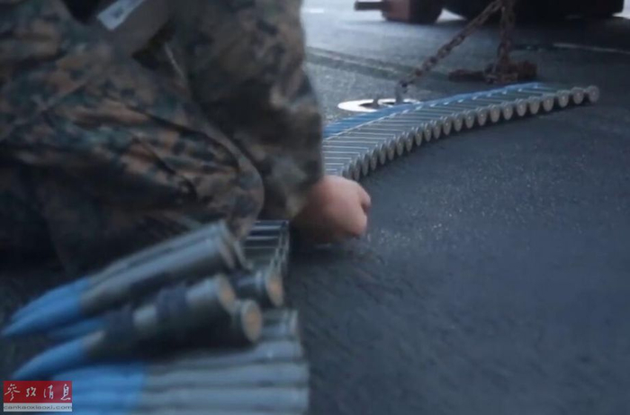 图为此次“黄蜂”号海上打靶期间,美陆战队员正在整理LAV-25所用的25毫米弹链。