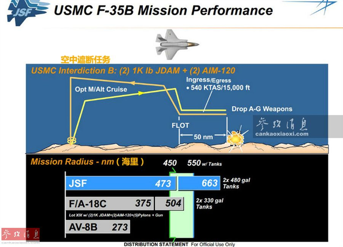 从洛马公司官方公开的F-35B作战性能看(如图所示),单架F-35B在执行空中遮断任务,携带2枚454千克级JDAM卫星制导炸弹和2枚AIM-120空空导弹(只使用内置弹舱)时,最大作战半径可达876千米,要远超采用同等载弹量的AV-8B和F-18C战机。